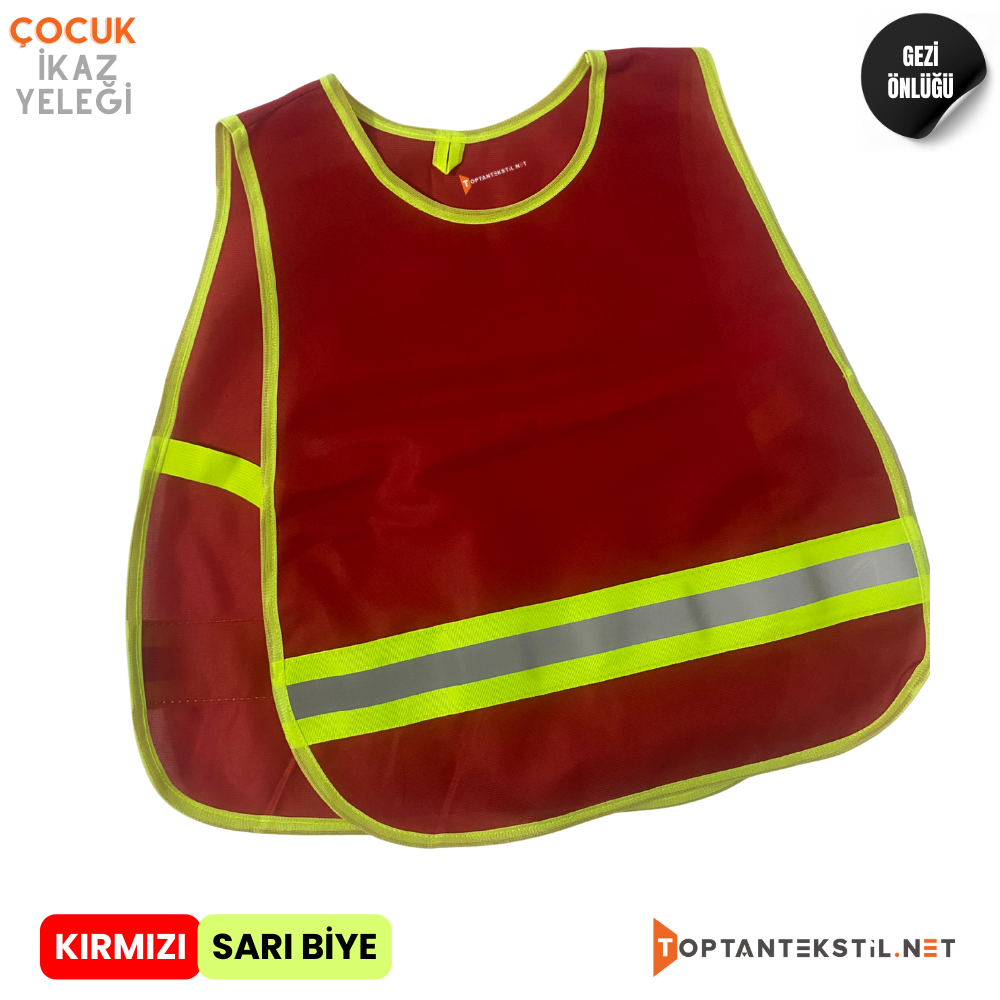 Çocuk İkaz Yeleği – Kırmızı (Sarı Biye) : Anaokulu Gezi Önlüğü : Çocuklarınızın Güvenliği İçin İdeal Seçim
