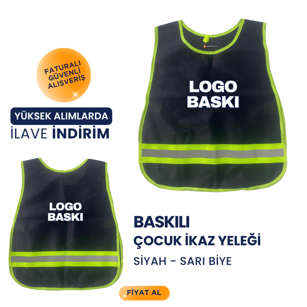 • Kurumsal Kimlik ve Ekstra Takip (Baskıya Uygun): Bu yelekler, okulunuzun logosunu, ismini veya iletişim numarasını bastırmak için mükemmel bir zemine sahiptir. Baskılı yelekler hem kurumsal bir görüntü sağlar hem de olası bir kaybolma durumunda çocuğun hangi okula ait olduğunun anında anlaşılmasını kolaylaştırır. Gezi Önlüğü – Çocuk İkaz Yeleği – Siyah (Sarı Biye)