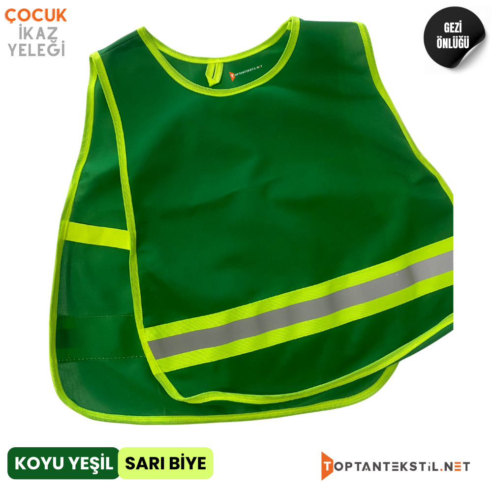 Çocuk Anatomisine Uygun ve Rahat: Yetişkin yeleklerinin küçültülmüş hali değildir; çocukların hareketli yapılarına uygun olarak hafif ve rahat polyester kumaştan üretilmiştir. Montun veya tişörtün üzerine kolayca giyilebilir, çocukların oyunlarını veya hareketlerini kısıtlamaz. Genellikle cırt cırtlı yapısı sayesinde çocuklar (belirli bir yaştan sonra) kendi başlarına da giyip çıkarabilirler. Gezi Önlüğü – Koyu Yeşil (Sarı Biye)
