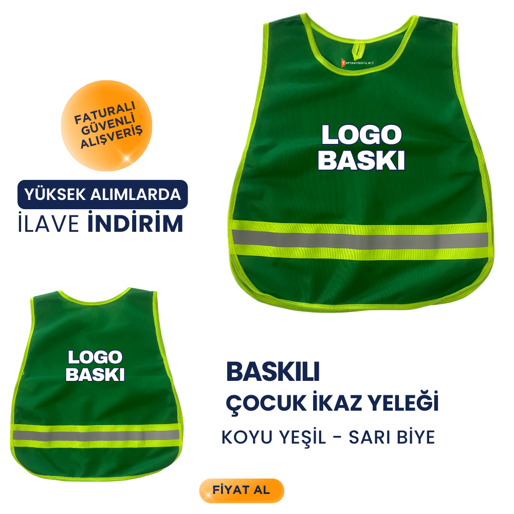 Kurumsal Kimlik ve Ekstra Takip (Baskıya Uygun): Bu yelekler, okulunuzun logosunu, ismini veya iletişim numarasını bastırmak için mükemmel bir zemine sahiptir. Baskılı yelekler hem kurumsal bir görüntü sağlar hem de olası bir kaybolma durumunda çocuğun hangi okula ait olduğunun anında anlaşılmasını kolaylaştırır. Gezi Önlüğü – Koyu Yeşil (Sarı Biye)